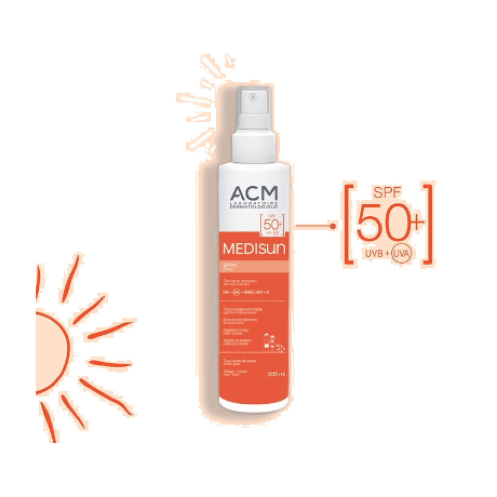 احمِ بشرتك من كل أنواع الأشعة مع سبراي ACM Medisun SPF 50+، الواقي من الشمس المتطور الذي يمنحك أقصى حماية متعددة الأطياف (UVA + UVB + الضوء المرئي + الأشعة تحت الحمراء)، بفضل تركيبة فريدة مناسبة للأطفال والبالغين من سن 3 سنوات.