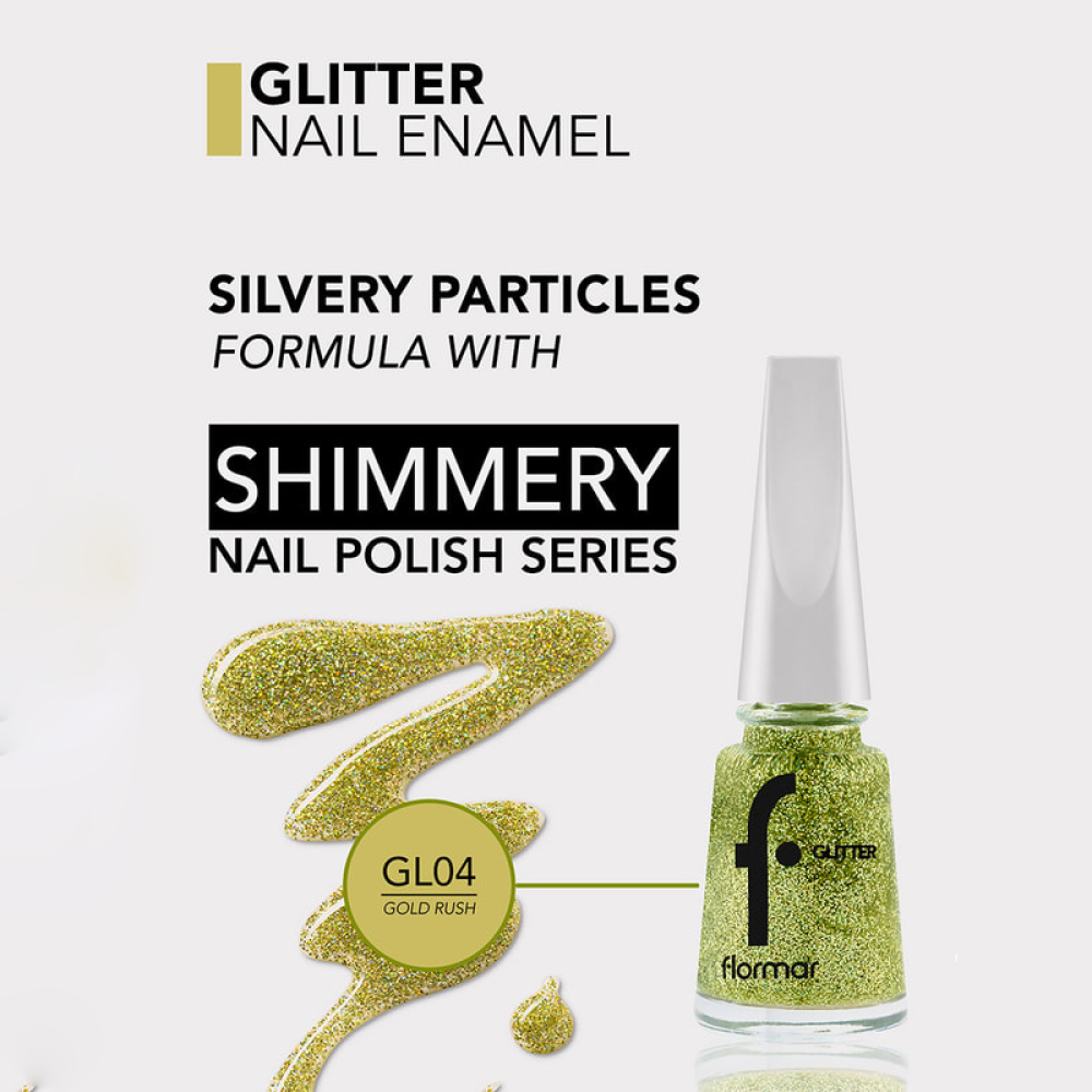 طلاء أظافر فلورمار جليتر هو طلاء أظافر برّاق ولامع. يُصنع بإضافة جزيئات لامعة إلى قاعدة فضية وردية. يُقدم أداءً عاليًا في مكياج الأظافر بفضل بريقه المكثف ومتانته الطويلة. لونه فضي وردي ولمعانه النهائي.