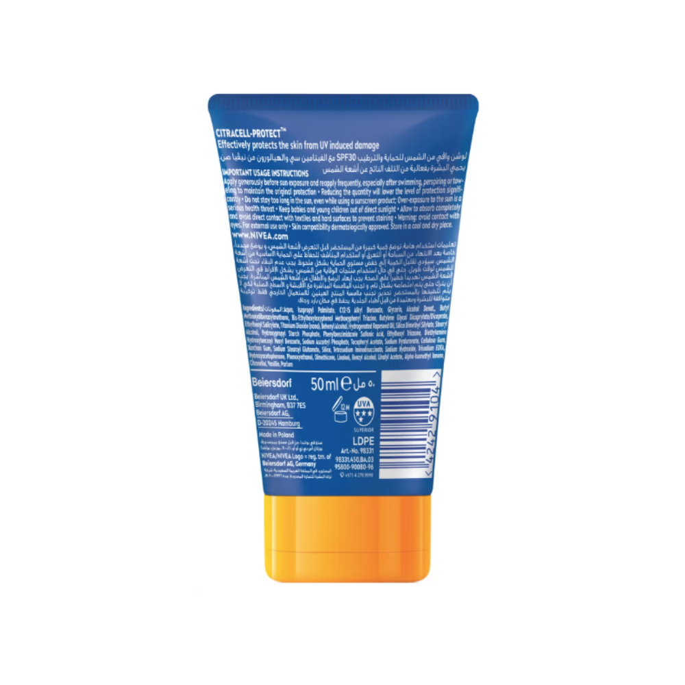 لوشن واقي الشمس من نيفيا يوفر حماية فعالة ضد أشعة الشمس الضارة مع ترطيب عميق يدوم طوال اليوم. يتميز بتركيبته الخفيفة غير الدهنية التي تمتصها البشرة بسرعة، مما يجعله مثاليًا للاستخدام اليومي تحت المكياج أو بمفرده للحفاظ على نضارة البشرة وحمايتها من الجفاف وأضرار الشمس.