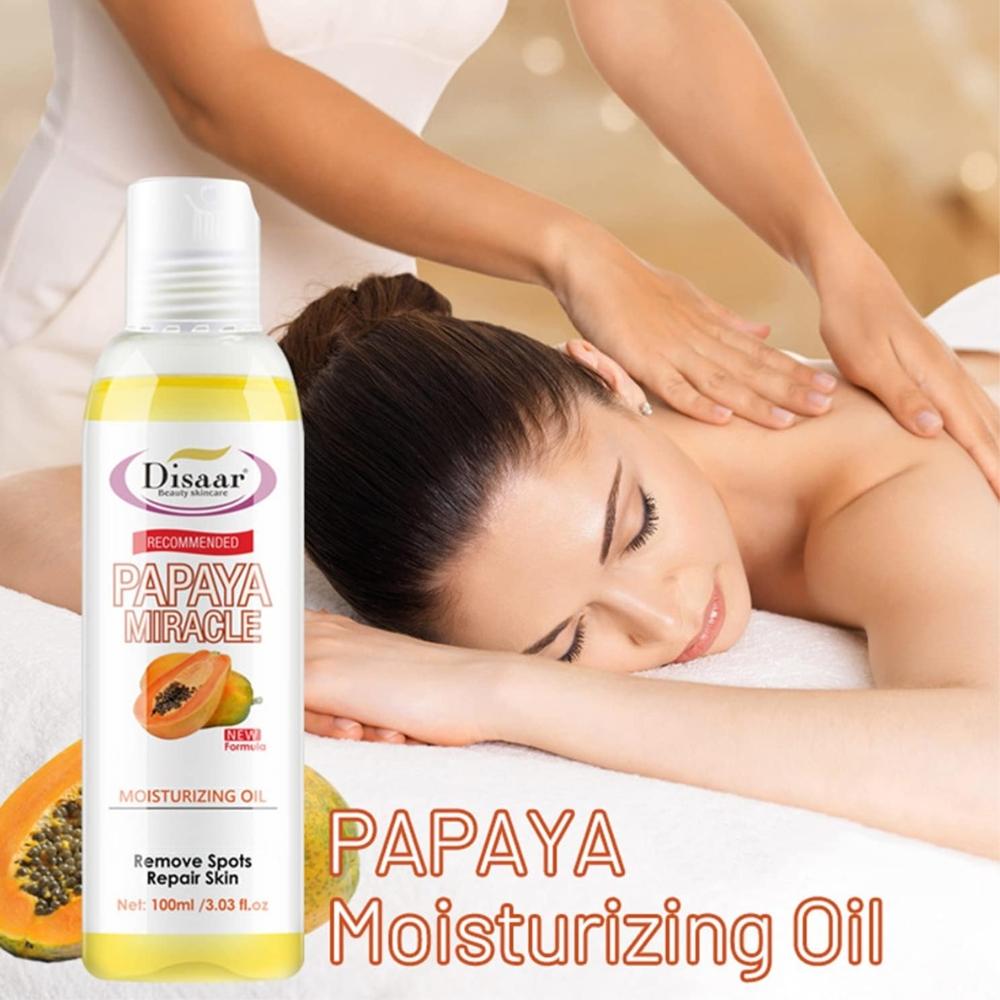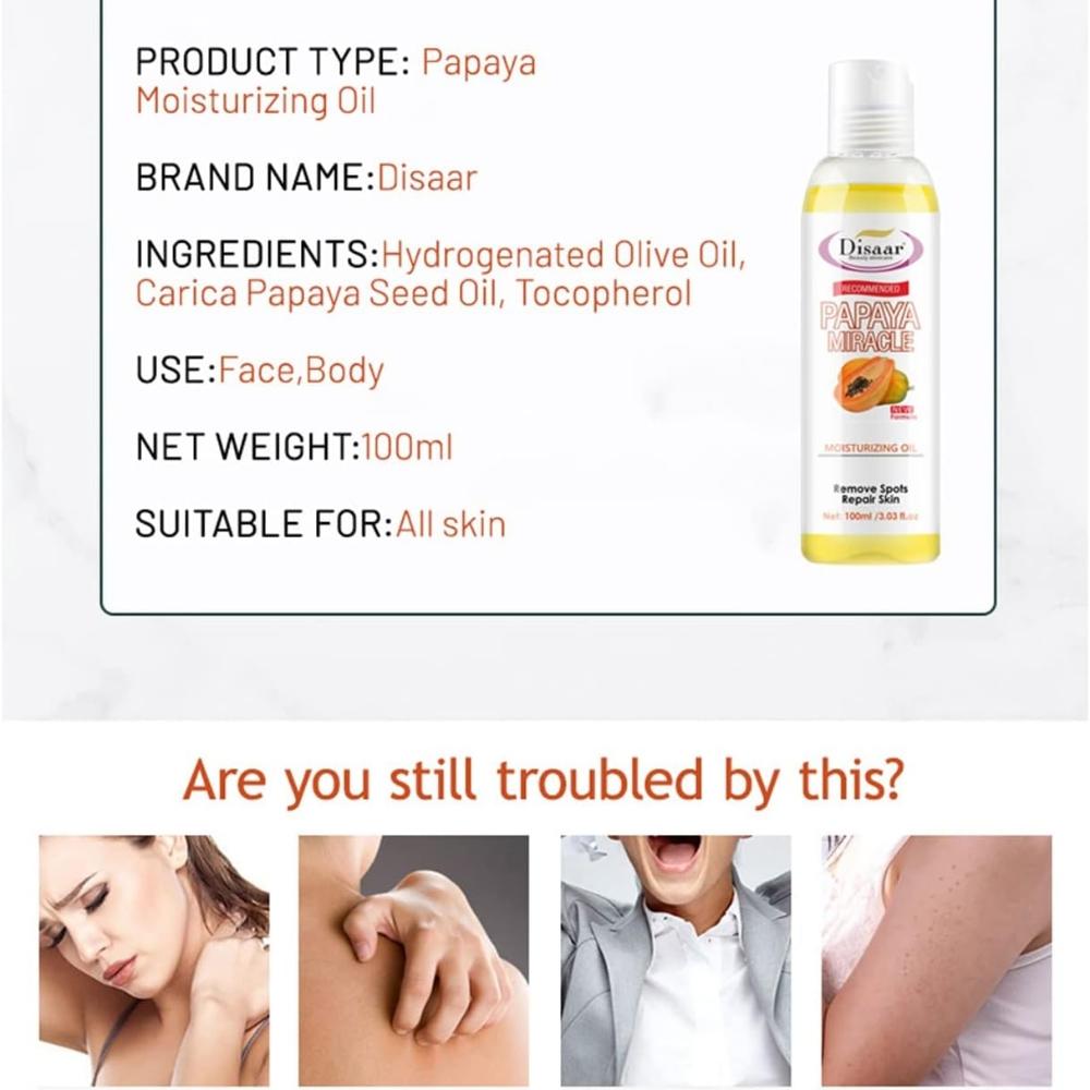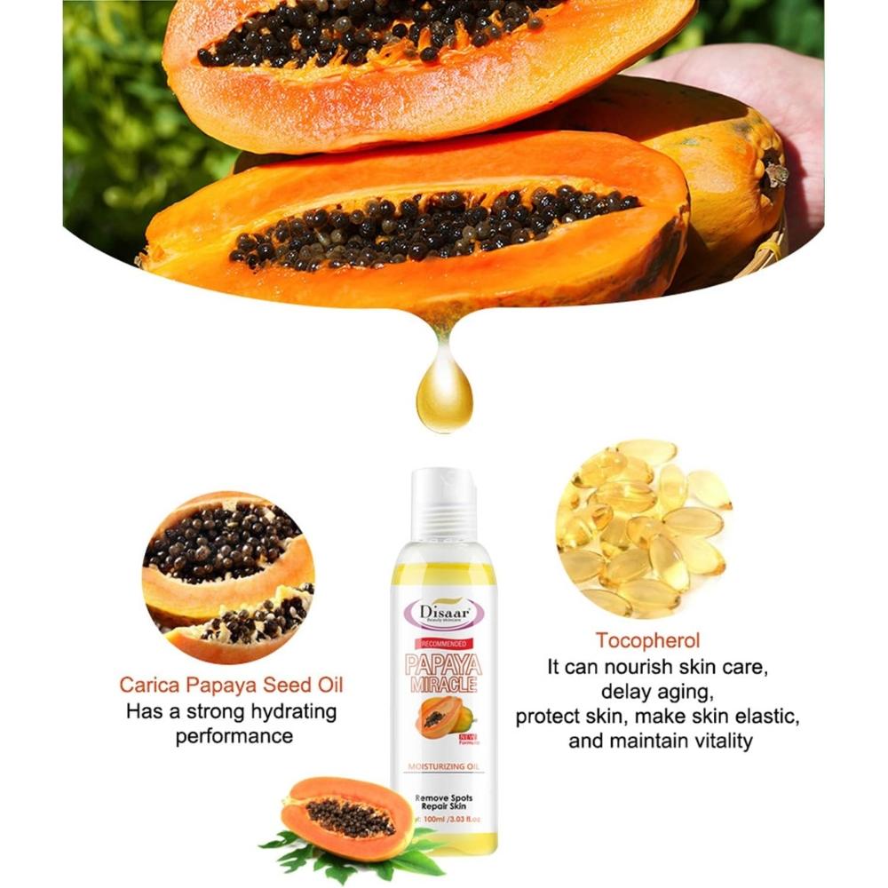 يحتوي الزيت على فيتامينات طبيعية وإنزيمات البابايا التي تساعد على تغذية البشرة، تجديد خلاياها،