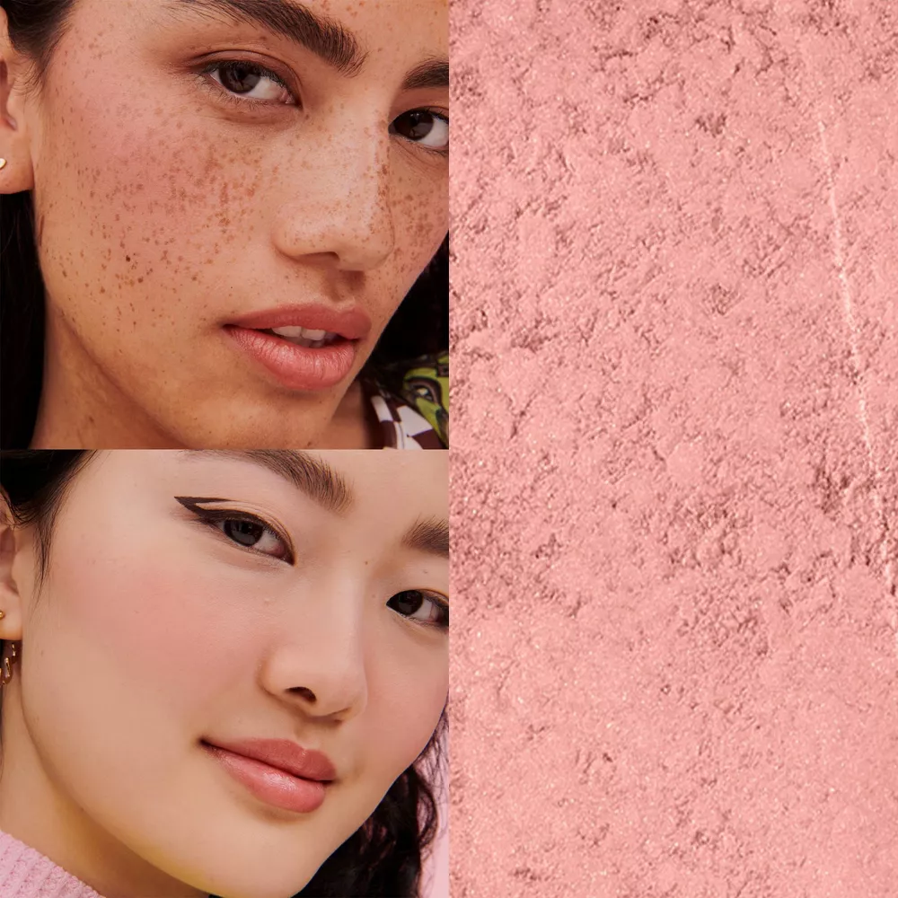 Sweep the blush brush into the cheeks. Mix and build as desired on bare face or over makeup.