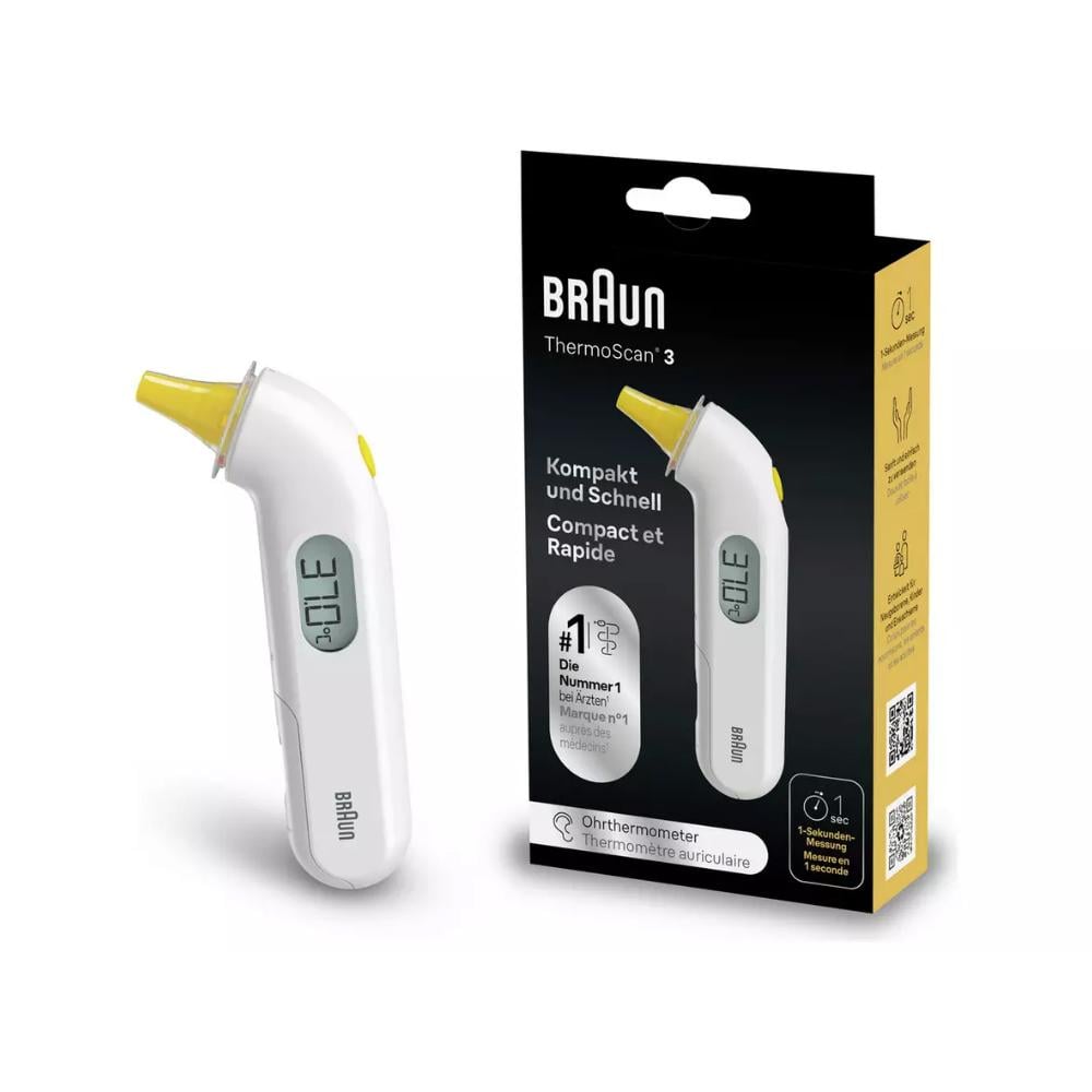 The Braun ThermoScan 3 (IRT3030) is a digital ear thermometer with a compact and easy-to-use design.